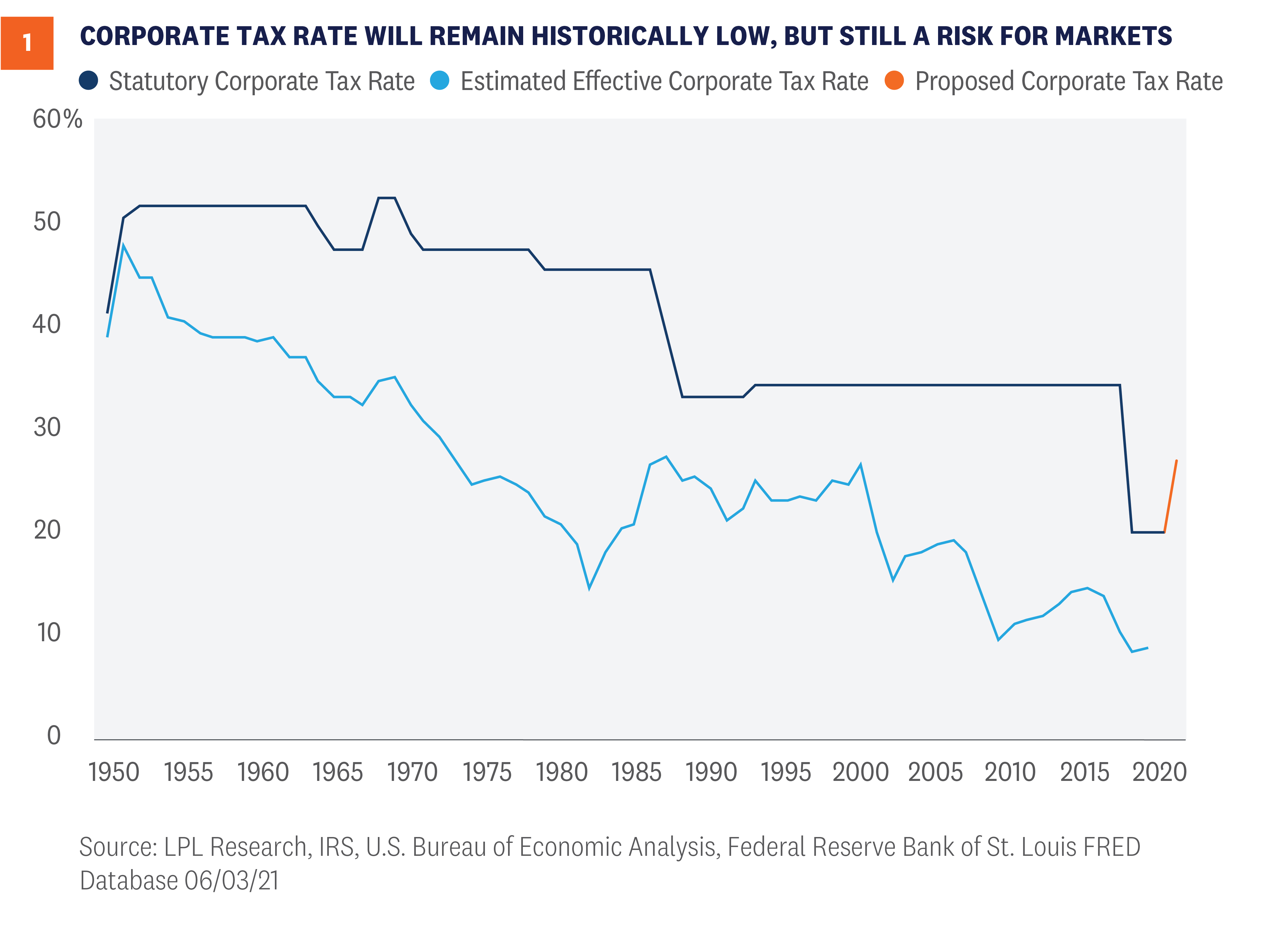 President Biden has proposed increasing the corporate tax rate to 28%, but that should be viewed as a bargaining position and we believe the more likely outcome is that we see the rate end up closer to 25%. Alternative approaches, such as increasing the minimum tax on businesses and raising the top rate less—or not at all, are becoming part of the conversation. The negative news for markets is that corporate earnings growth will likely take a direct hit that is approximately equal to the size of any tax hike. Because the stock market is fundamentally driven by earnings growth, the tax impact will likely be a headwind for equity markets. On the positive side, this move has been anticipated for quite some time and should not be much of a surprise to markets. Further, as shown in [Figure 1], excluding the TCJA rate, this will still be the lowest tax rate in about 70 years and the effective tax rate has also declined.